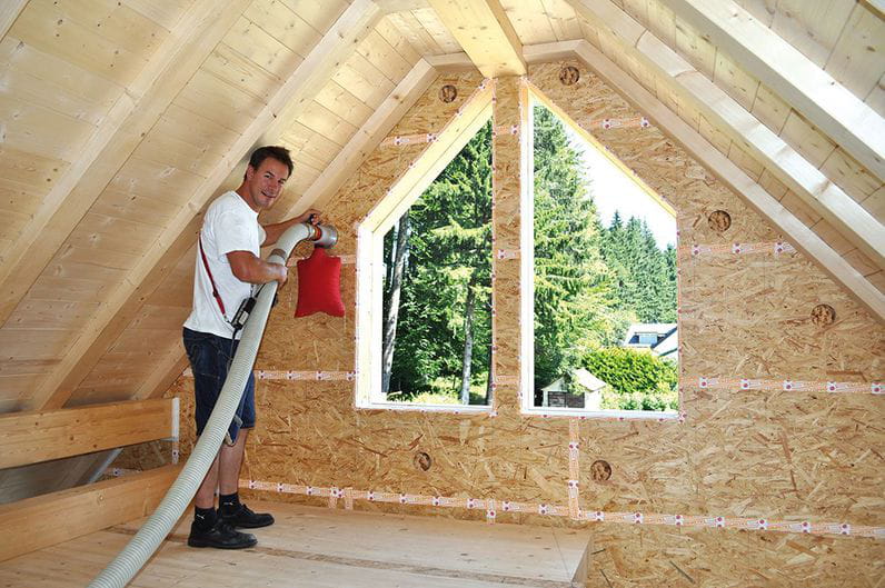 Gutex Thermofibre es un aislamiento de fibra de madera para el ‘relleno’ de cámaras previamente preparadas para ello. Su aplicación se efectúa mediante insuflado, es decir, mediante el transporte conjunto de aire y material. Se compone de pura fibra de madera suelta que mediante la técnica de insuflado rellena todos los huecos sin juntas ni fisuras, adaptándose perfectamente a la geometría del elemento constructivo.