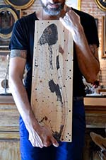 P.- ¿Cómo se comporta la madera en su papel de soporte? ¿Qué ventajas/desventajas o complicaciones tiene?R.- El mayor problema que me encuentro es la humedad o si está demasiado seca. La tinta no responde igual y se expande la tinta de diferente forma. Para consguir líneas limpias debo secar más la madera.